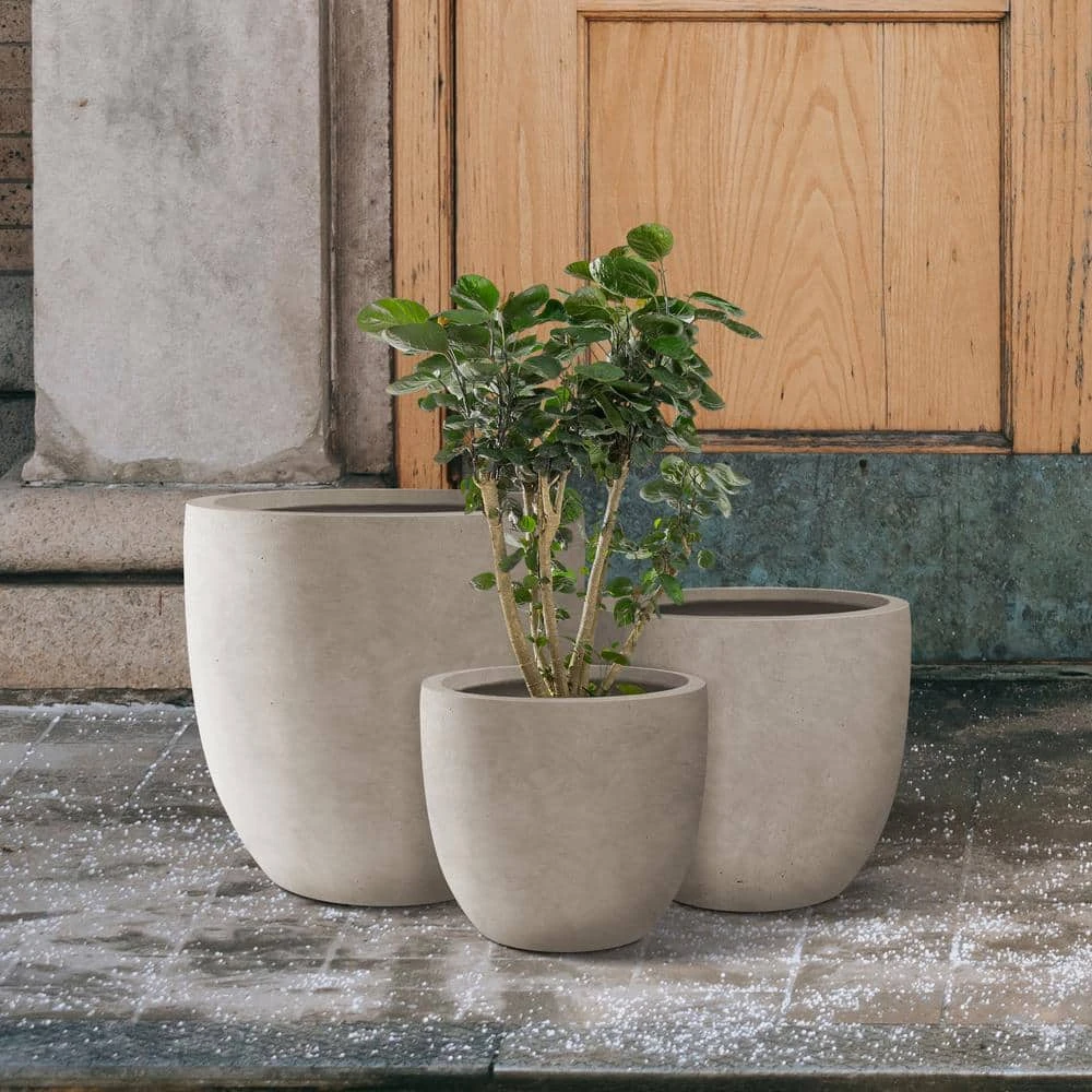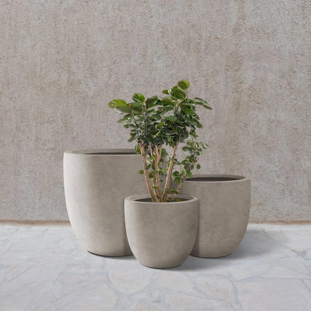 These elegant round planters have authentic concrete finish with visible pores making them beautiful contemporary pieces. The look and feel is true concrete but it weighs substantially less than it looks and makes it easier to move around, it is smooth instead of rough concrete potters you might be used to and will help you maintain a modern design throughout your space. The size is very generous and can hold a good amount of plants without looking crowded. Would look great on apartment balcony or large backyard patio, you can’t go wrong with the grey finish as it blends well with any decor, they can be used individually, as a set or in a row to promote unity. Made of lightweight concrete and weather-resistant fiberglass through an ecofriendly manufacturing process, it has all the advantages of concrete such as strength, durability, weather and damage resistance, strong UV resistant ability and stay well in wind, rain, hot and cold season.