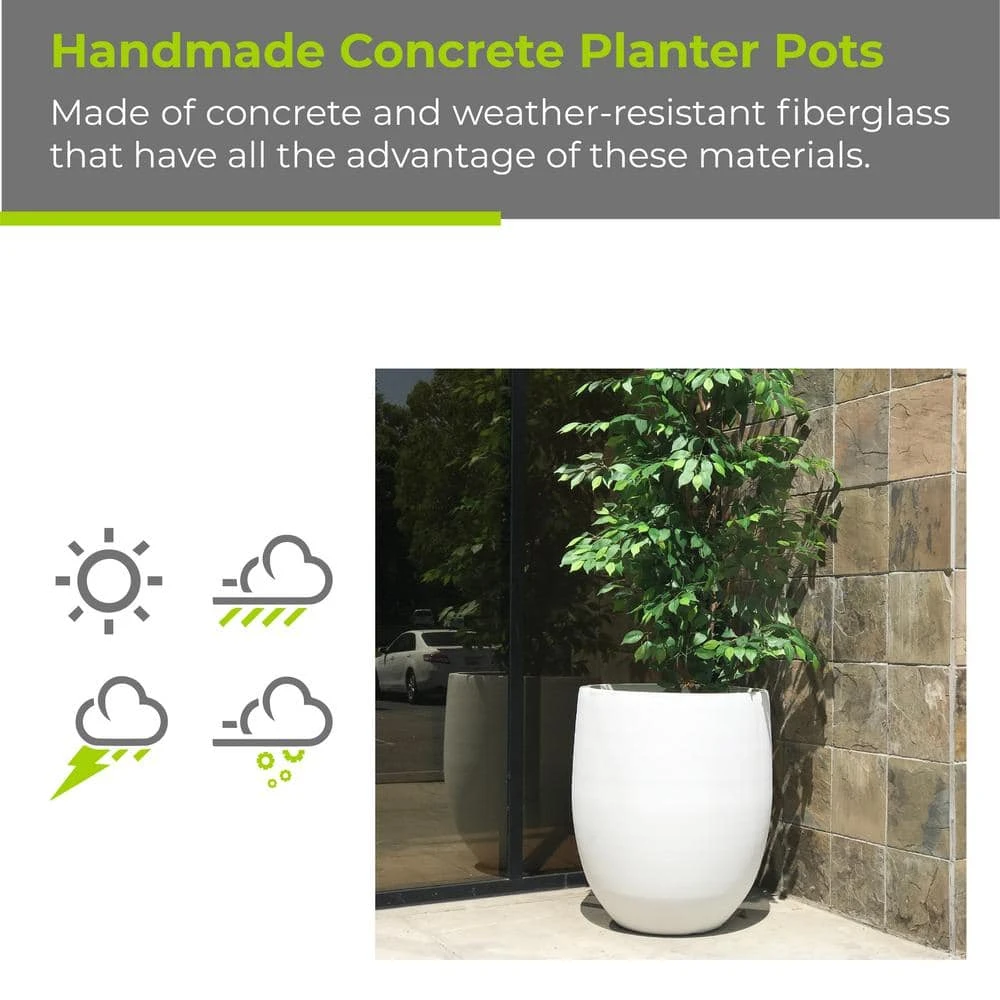 - Handmade concrete planter pots made of concrete and weather-resistant fiberglass that have all the advantages of these materials, such as strength, durability, weather and damage resistance and long-lasting color and has a drainage hole