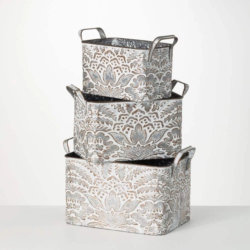 Embossed with the familiar Sullivan’s flourish pattern, this trio of metal containers come in 3 graduating heights of 7.5 in., 8.5 in. and 9.5 in. Accompanied with built-in loop handles, these planters are a cinch to move from room to room. Exclusive exploded artichoke pattern. Over the last 52-years, Sullivans has become an industry leader in home decorations. Our brand is rooted in tradition while incorporating modernized trends to keep your home looking up to date with timeless style. Here at Sullivans, we pride ourselves on creating product designs focused on quality and value, ensuring that our customers have access to beautiful products at reasonable price points.